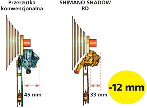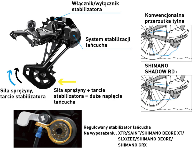 Shimano SHADOW RD+ - Mechanizm przerzutki tylnej SHIMANO SHADOW RD jest przeznaczony do bardziej agresywnej jazdy. Jej niezwykle niski profil niesie ze sobą wiele zalet. Dzięki niemu i dzięki konstrukcji o pojedynczej sprężynie przerzutka nie uderza o tylne widełki w trudnych warunkach. W efekcie praca układu jest płynna i cicha.