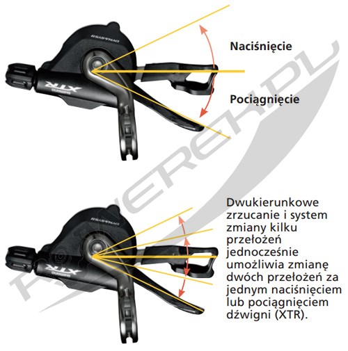 2WAY-RELEASE- Dźwignia zrzucająca w systemie zmiany przełożeń RAPIDFIRE Plus jest często nazywana spustem, ponieważ operuje się nią tak jak pistoletem — przez pociągnięcie w kierunku chwytu. Manetką zrzucającą systemu zmiany przełożeń RAPIDFIRE Plus z grup od ALIVIO do XTR można operować w taki sam sposób, lecz dodano również możliwość zrzucenia przełożenia poprzez naciśnięcie kciukiem.