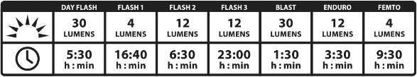 Lampka może pracować maksymalnie 23 godziny w trybie Flash 12 lm, przy trybie Day Flash 30 lm akumulator pozwoli na pracę przez 5,5 godziny.