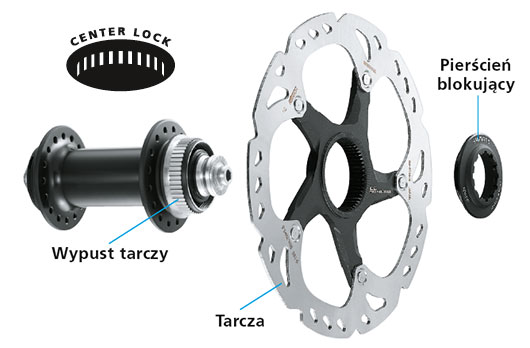 System CENTER LOCK umożliwia łatwy montaż tarczy za pomocą wypustu i pierścienia blokującego.